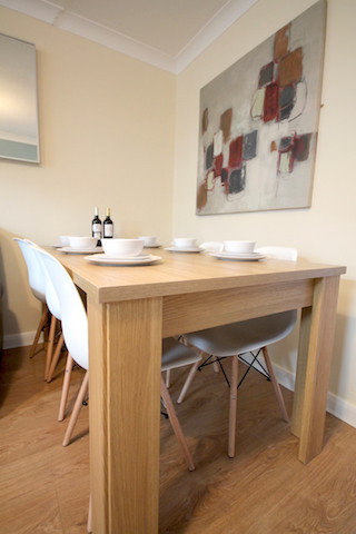 This light, bright room has leather sofas, digital TV, modern artwork and a dining table and chairs.