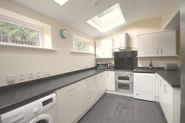 High Spec. modern kitchen with a dishwasher, tumble drier, washing machine, cooker, stainless steel chimney hood, fridge freezer, microwave, and lots of other cooking musts!